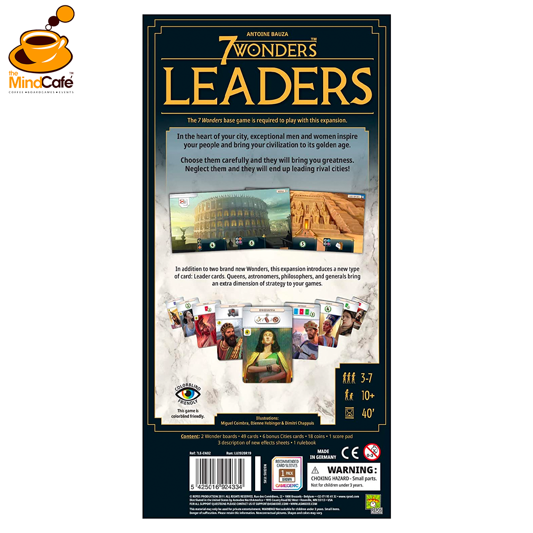 In the heart of your city, exceptional men and women inspire your people and bring your civilization within reach. Choose them carefully and they will contribute to your greatness. Neglect them and they end up leading rival cities. In addition to two new Wonders, this expansion brings you a new card type: Leader, Queen, Astronomer, Philosopher, and General cards will add an extra strategic dimension to your games. The new edition features a new gold leaf box; improved design for better immersion in the game; two new wonders designed for expansion; a booklet outlining the expansion’s new effects and integrating the leader anniversary pack and leader cards featured in the original Cities and Armada expansions.