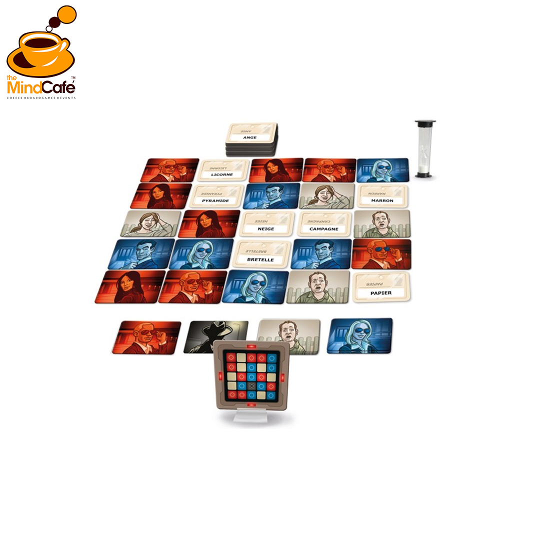25 character cards (red, blue, innocent bystanders, double agent and assassin)