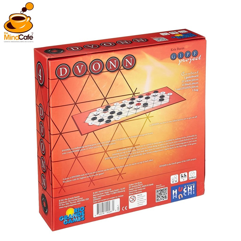 The players place the pieces on empty spaces of the board, without restrictions. They place the DVONN-pieces first and their own pieces next. Then they start stacking pieces on top of each other. A single piece may be moved 1 space in any direction, a stack of two pieces may be moved two spaces, etc. A stack must always be moved as a whole and a move must always end on top of another piece or stack. If pieces or stacks lose contact with the DVONN-pieces, they must be removed from the board. The game ends when no more moves can be made. The players put the stacks they control on top of each other and the one with the highest stack is the winner.