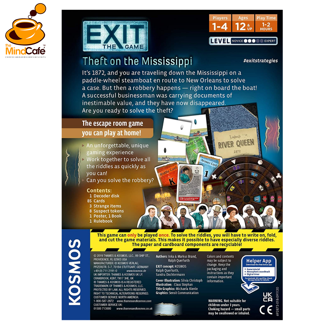 Can you solve the robbery on the Mississippi River? You’re a team of investigators traveling the Mississippi on a paddle-wheel steamboat in 1872. Last night there was a robbery. A successful businessman was carrying documents of inestimable value, and now they have disappeared! The captain has asked for your help in finding out who did it, but time is running out. Can you find the culprit before the riverboat docks in New Orleans and the thief escapes into the night? Work together and solve all the puzzles together as fast as you can!