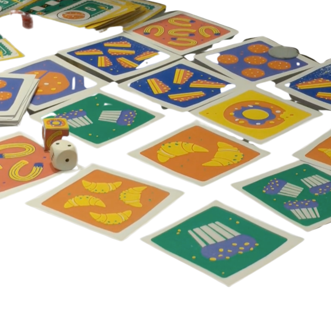 Hands off! is a fast-paced game of quick reflexes and visual discrimination. Players race to identify and touch the card matching the combination rolled on two dice: one for numbers and one for treats. As the game progresses, players face increasing constraints that make their progress trickier–and give them the chance to hinder their opponents. With an adaptable handicap system, Hands off! ensures balanced gameplay between players of different skill levels, making it accessible and fun for everyone.