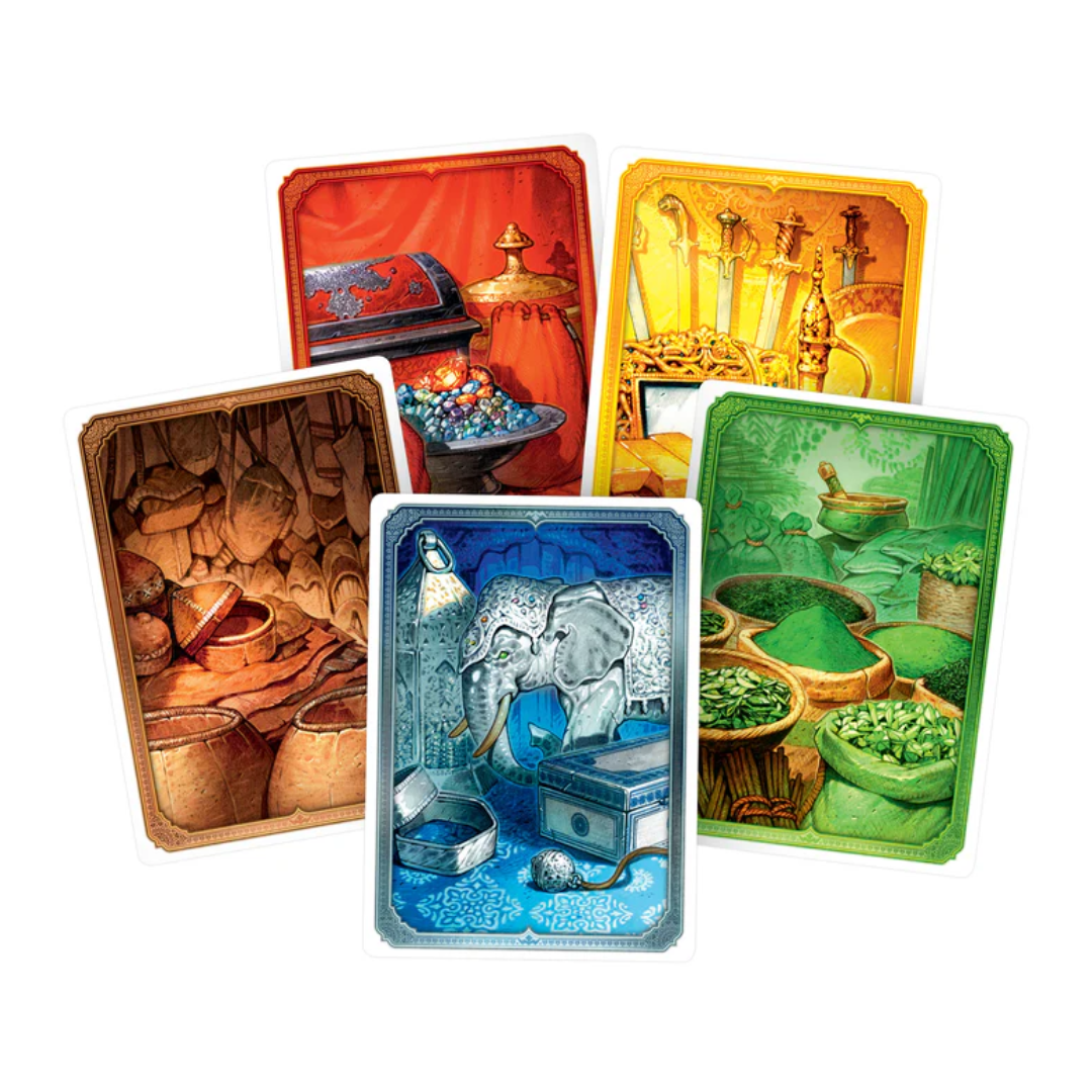 On your turn, either take cards from the market (goods or camels) or sell goods for points. Selling more cards at once gives bonus rewards, but prices drop as the game progresses. Camels help you trade but don’t score directly. Win rounds by earning the most profit — first to win 2 rounds (Seals of Excellence) wins the game!