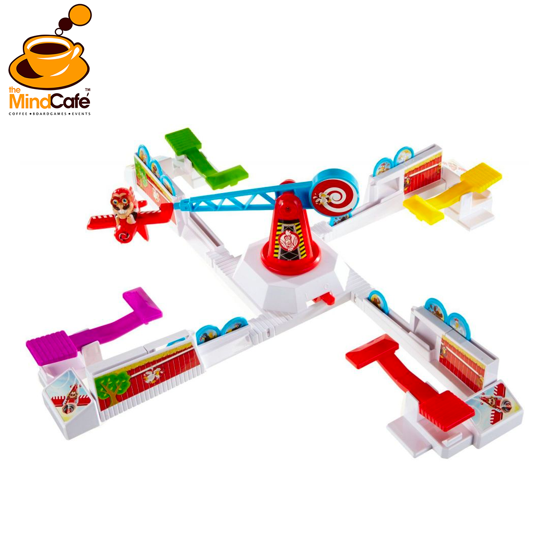 In Loopin’ Louie, a battery-powered motor placed in the center of the table rotates a boom with a little plastic plane. Four radial arms lead out to the players’ barns and the chickens they’re trying to protect. Each barn has a little lever, which is used to knock the rotating plane away from your chickens and hopefully into someone else’s. When only one player has chickens remaining, he or she wins the game. Very silly and very addictive.