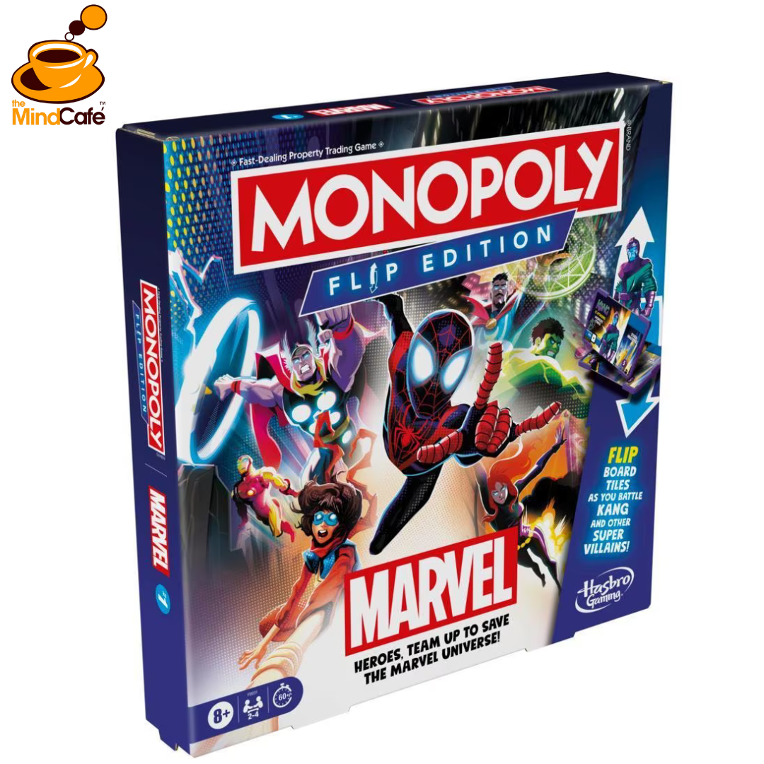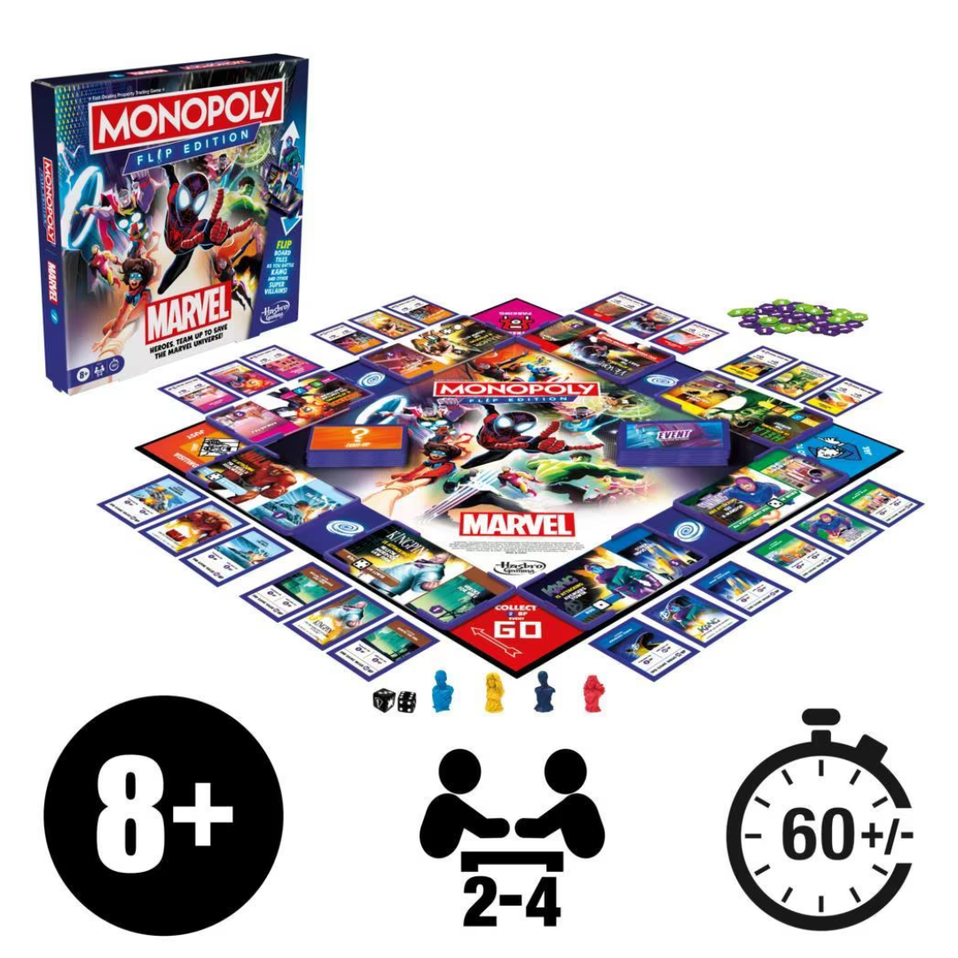 Marvel-themed monopoly game: step into the marvel universe with the monopoly flip edition: marvel board game! it features favorite marvel heroes and villains, familiar locations, and exciting themes