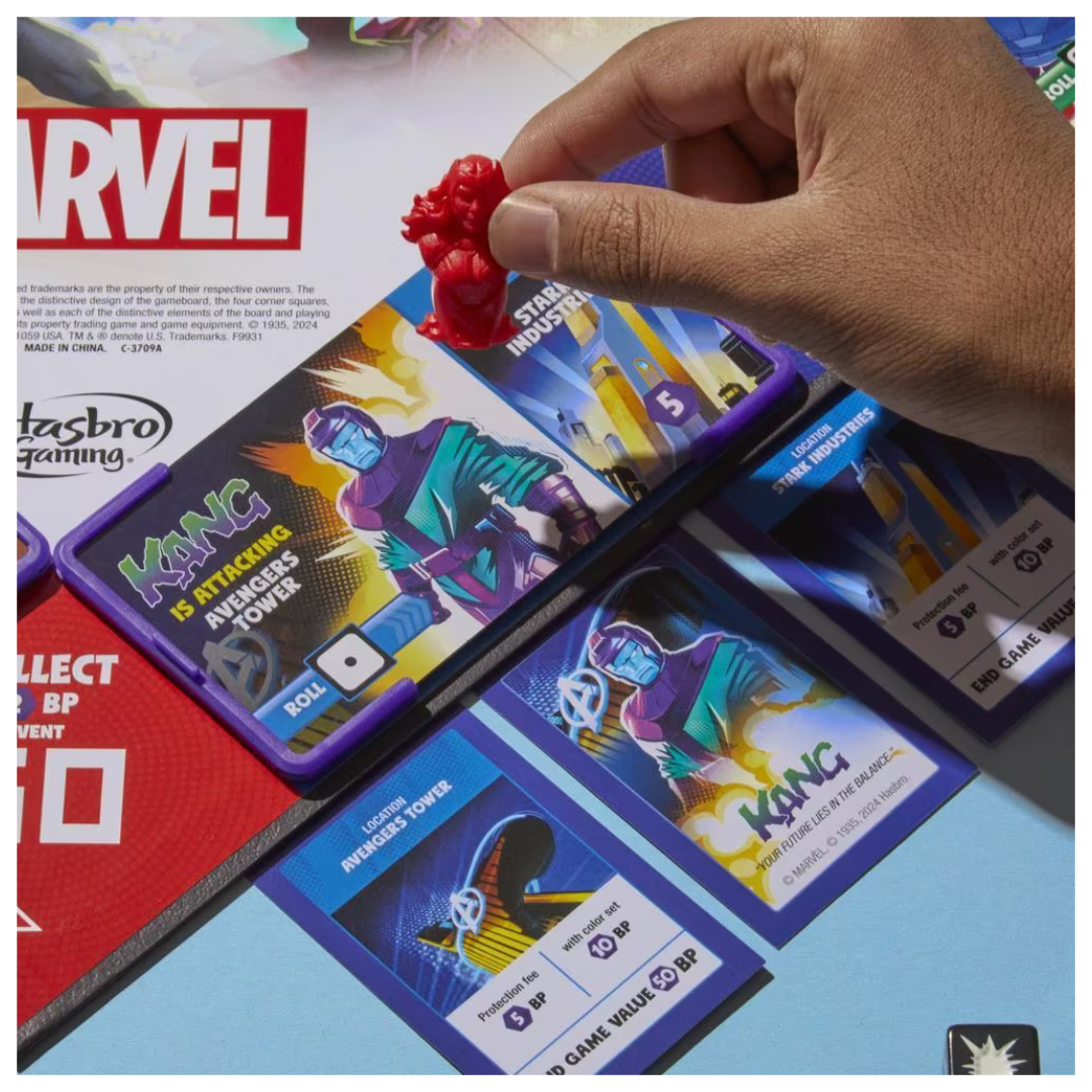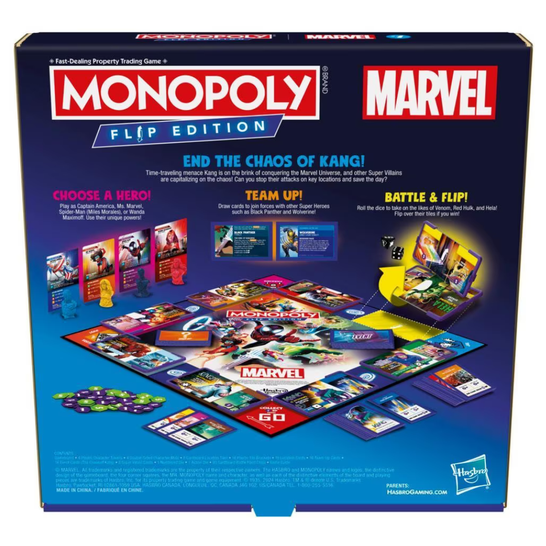 End the chaos of Kang in the Monopoly Flip Edition: Marvel board game! Time-traveling menace Kang is on the brink of conquering the Marvel Universe, and other Super Villains are capitalizing on the chaos. Playing as Captain America, Ms. Marvel, Spider-Man (Miles Morales), or Wanda Maximoff, players must team up with other Super Heroes to battle the villains, then flip gameboard tiles and race to secure the locations under attack. In this fun kids game, instead of earning money, players can earn cardboard Battle Point chips by collecting protection fees for their secured locations, teaming up with other heroes, and more. The player with the most Battle Points when all the locations have been secured wins! This strategy board game amps up the fun on Family Game Night, and it’s a great gift for kids, teens, and fans of Marvel and the Monopoly board games. For 2-4 players, ages 8 and up. 2023 Marvel. The Hasbro and Monopoly names and logos, the distinctive design of the gameboard, the four corner squares, the Mr. Monopoly name and character, as well as each of the distinctive elements of the board and playing pieces are trademarks of Hasbro for its property trading game and game equipment.