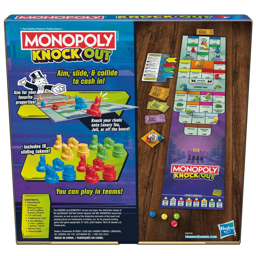 Up and active family party game: slide tokens to knock out rivals and grab cash in the monopoly knockout game! it’s all fans love about the monopoly game in a lively party game that gets the family moving.
