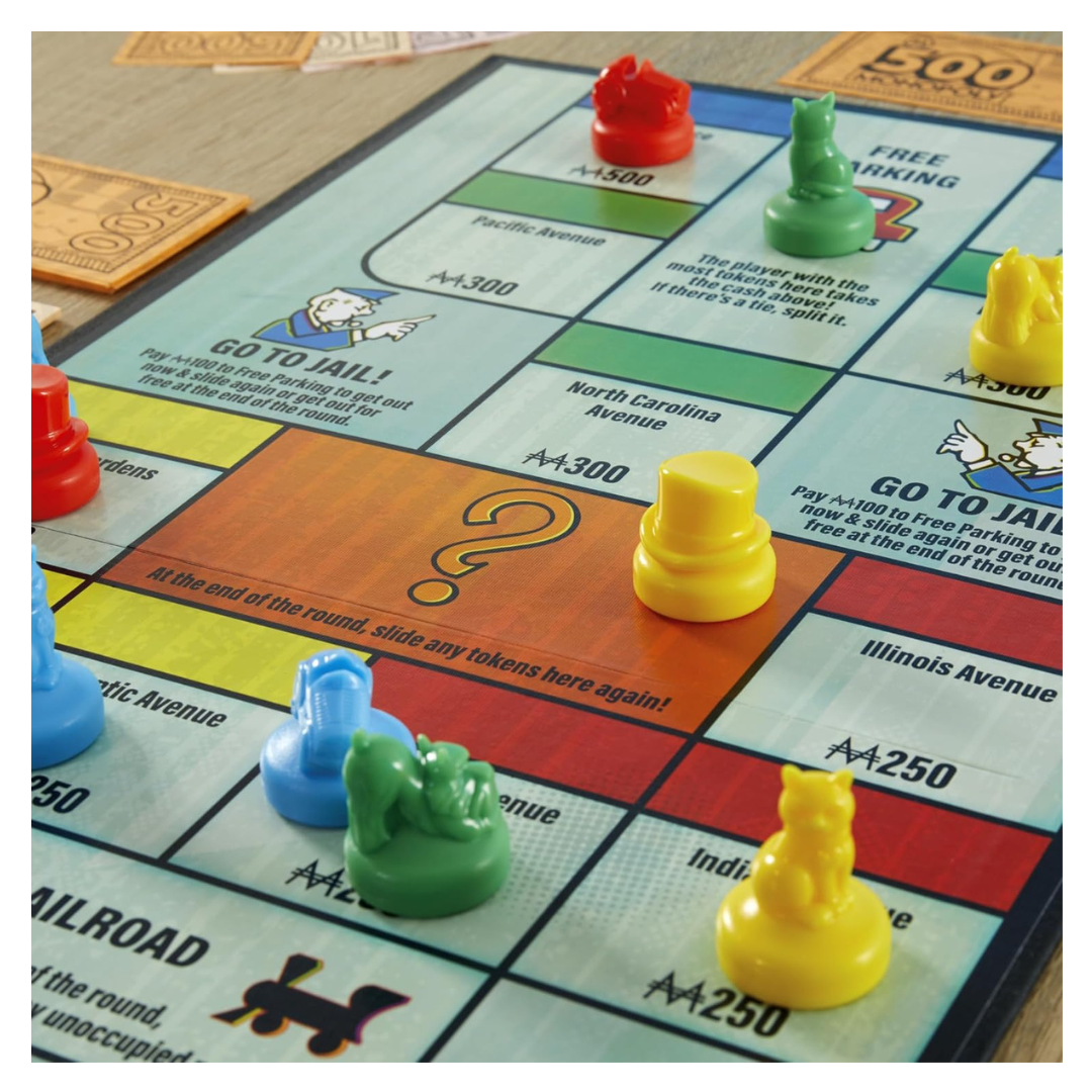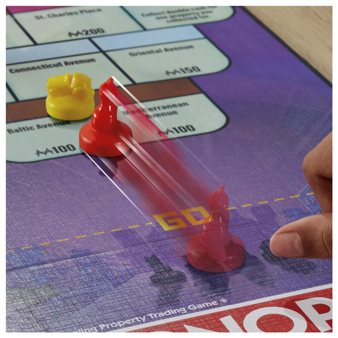 Gameboard is over 3 feet long: players slide their sliding tokens down the long gameboard that features favorite monopoly properties and familiar spaces, like chance and railroad