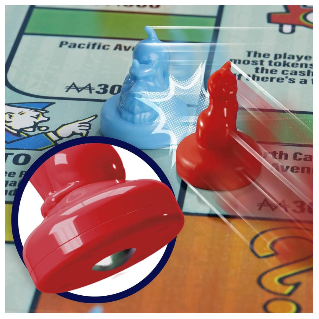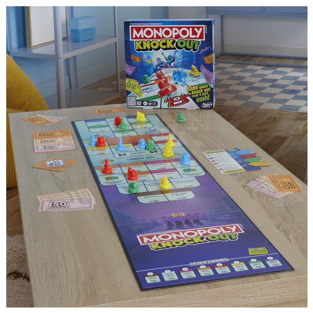 Up and active family party game: slide tokens to knock out rivals and grab cash in the monopoly knockout game! it’s all fans love about the monopoly game in a lively party game that gets the family moving.