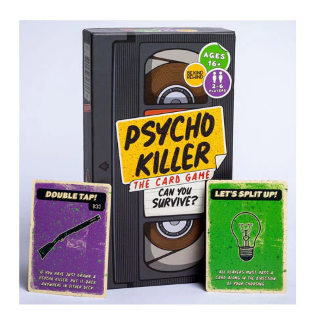 You can run, but you can’t hide from the PSYCHO KILLER! Looming in the deck, along with every cliche horror trope you can think of, is the dreaded Psycho Killer. Use your cards to avoid his wrath with boobytraps, outwit his fury with clever defensive measures, or leave your fellow players for dead. When he shows up, he’ll hack and slash his way through you and your friends! The player who’s taken the lease amount of damage after he shows up five times wins. Recommended for 2-6 players, ages 16 and up.
