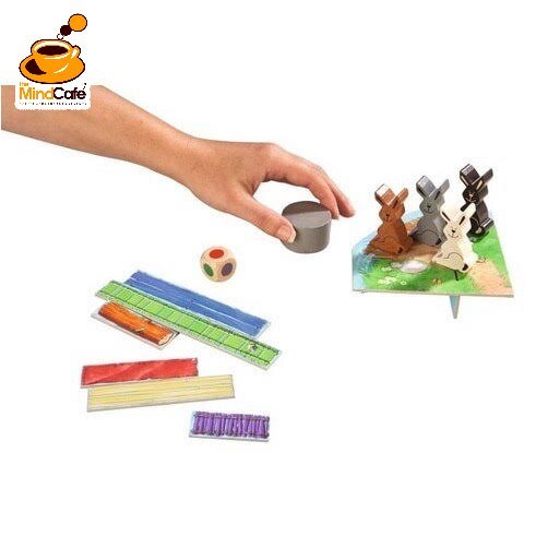The rabbits in Rüben Rallye all want to reach the carrot patch, but to do so, they need to cross the river first — and to do that, they need to make use of planks and stones lying nearby. In the game, all the rabbits start on a platform, and the carrots await on another platform that players set some distance away. On a turn, a player rolls a color die, picks up the cardboard “plank” of that color, places a wooden “stone” some distance away from where their rabbit is located, then tries to place the plank so that their rabbit will be able to move onto the stone. If the player succeeds, the rabbit moves; if they misjudged where to place the stone, the rabbit stays where it is. By repeating this process, the rabbits move down the “stream” to where the carrots are located, with the first player to reach a carrot winning the game. Additional carrots are included so that players can compete for second and third place.