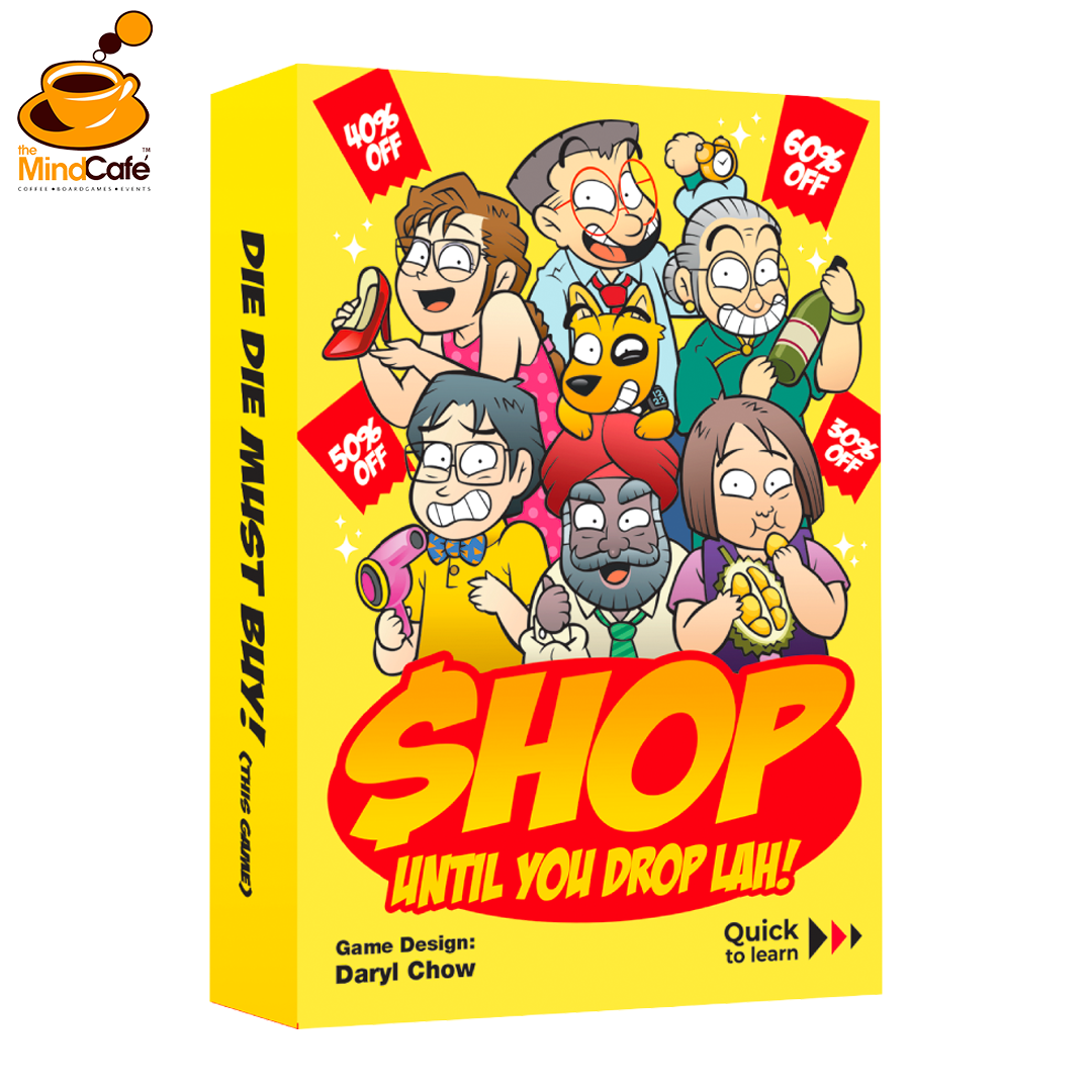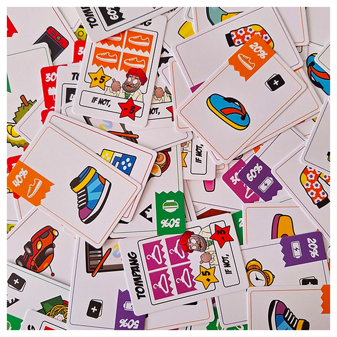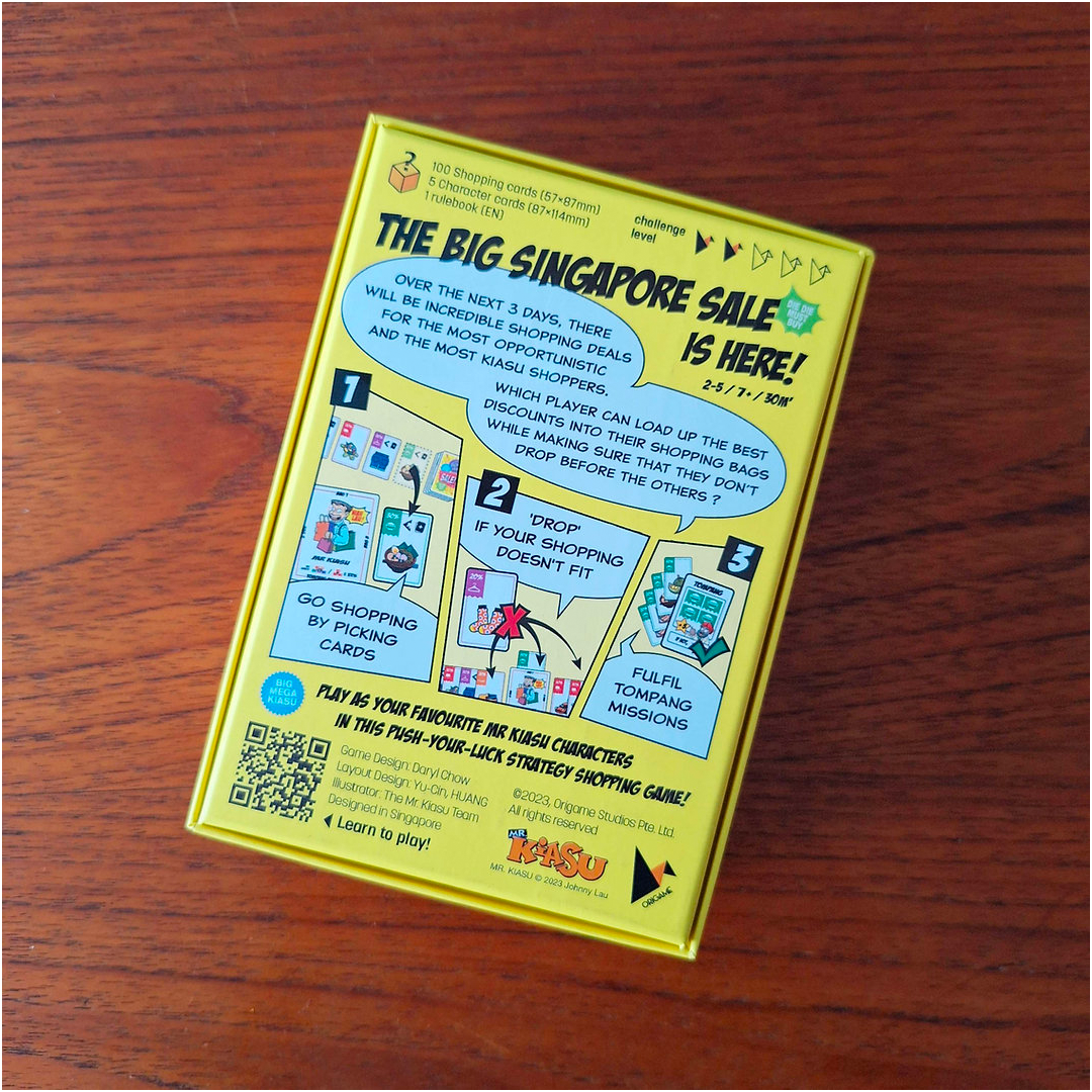 Play as your favourite Mr Kiasu characters in this strategic push-your-luck card game about shopping. Which player can load up on the most discounts without dropping their bags?