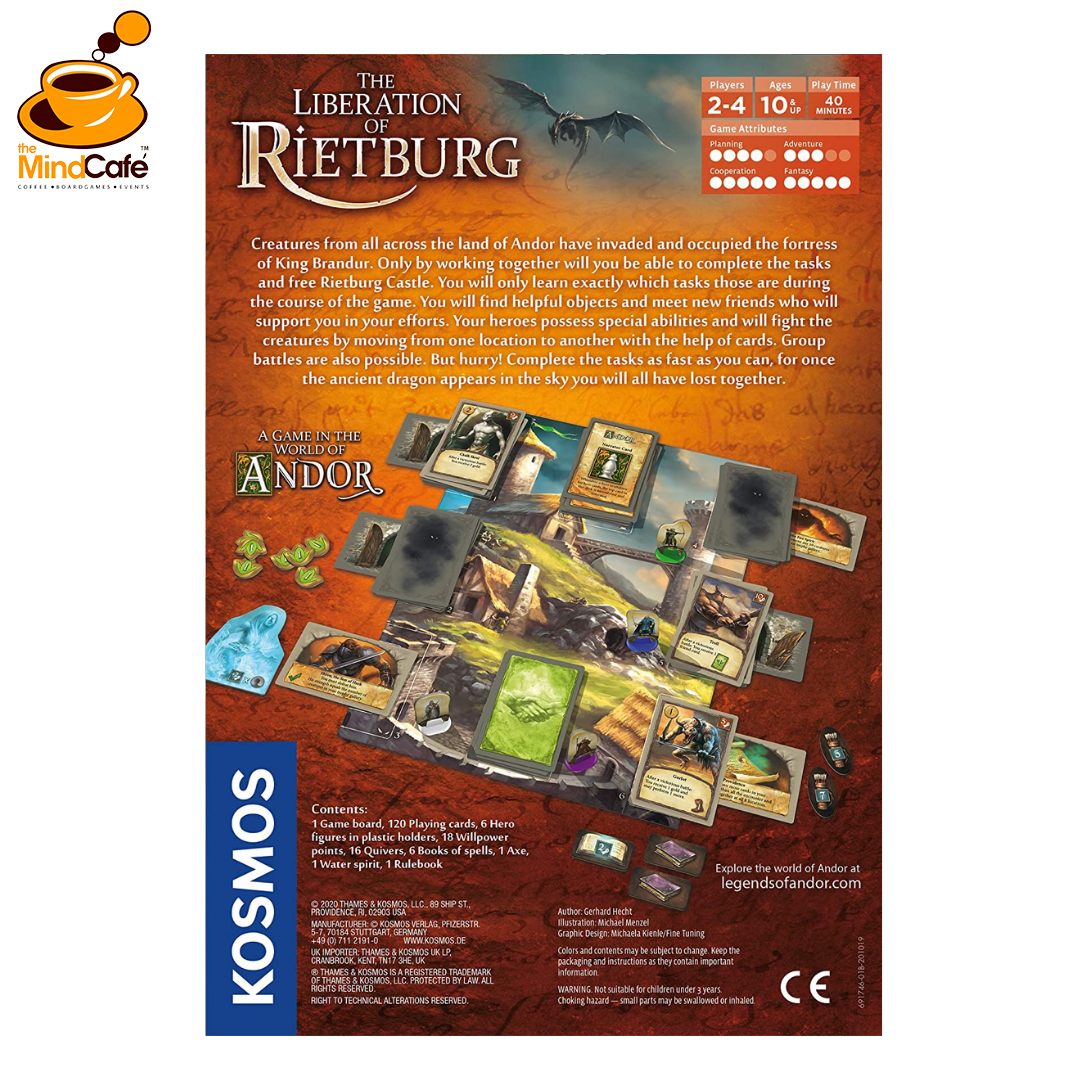 In this stand-alone game set in the fantasy world of Andor, Rietburg Castle has been taken over by evil creatures. Without delay, you — the Heroes of Andor — take on the task of rescuing old King Brandur’s fortress and protecting its remaining inhabitants. But time is of the essence as the dragon Tarok has already set out to destroy the stronghold once and for all. The prophecy foretells that you can only prevent its destruction if you are able to accomplish the four tasks. But which tasks are those? Must you appease the Fire Spirit or kindle the Hadrian Fire? Should you free prisoners from the creatures’ dungeons or submit to the will of the old Skral witch? You are going to have to play to find out.