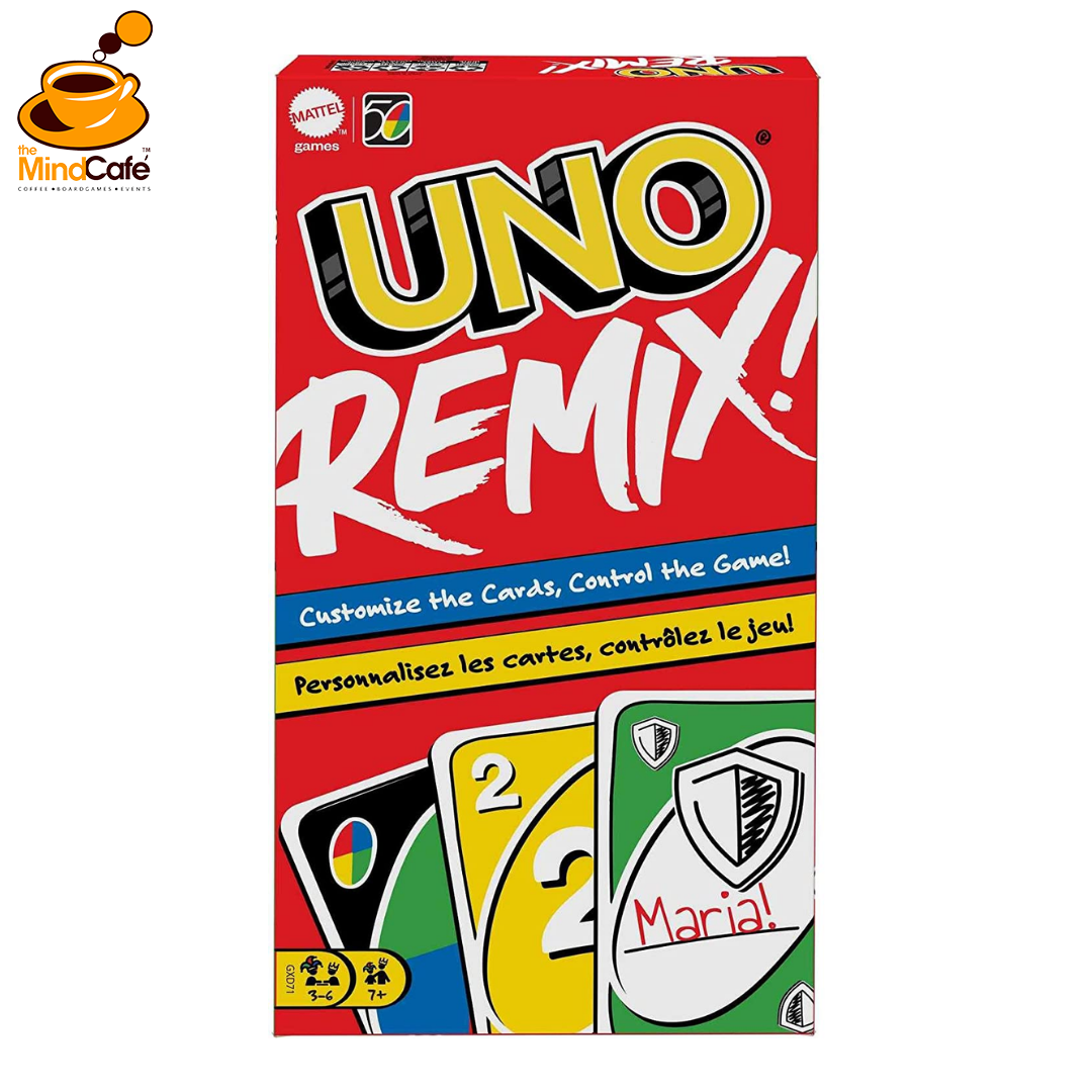 The UNO Remix game invites players to personalize an UNO deck that evolves with every round. Beginning each round, players add special cards or write-on cards, which changes the game going forward. They can personalize cards to specific players (such as “Skip to Jeff” or “Draw 2 Maria”). Some cards add a mark to increase the amount the next player draws, some block penalty cards, and many more! Any group can create a unique deck for themselves! And this edition comes in a sturdy tin to keep the cards together. And, as always, when a player has only one card left, they must yell “UNO!” Colors and decorations may vary.