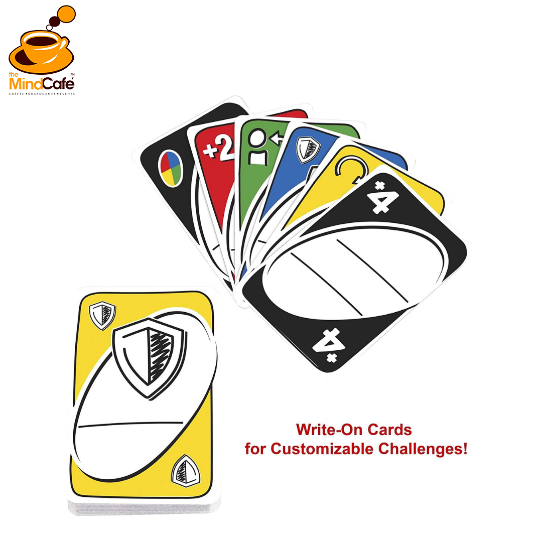 Players use the write-on option to customize the cards and control the game. Penalty cards can get crazy and strategic — “Skip to Jeff,” add an opponent’s name to the Wild Draw 4 card or even block a penalty with a Shield card!