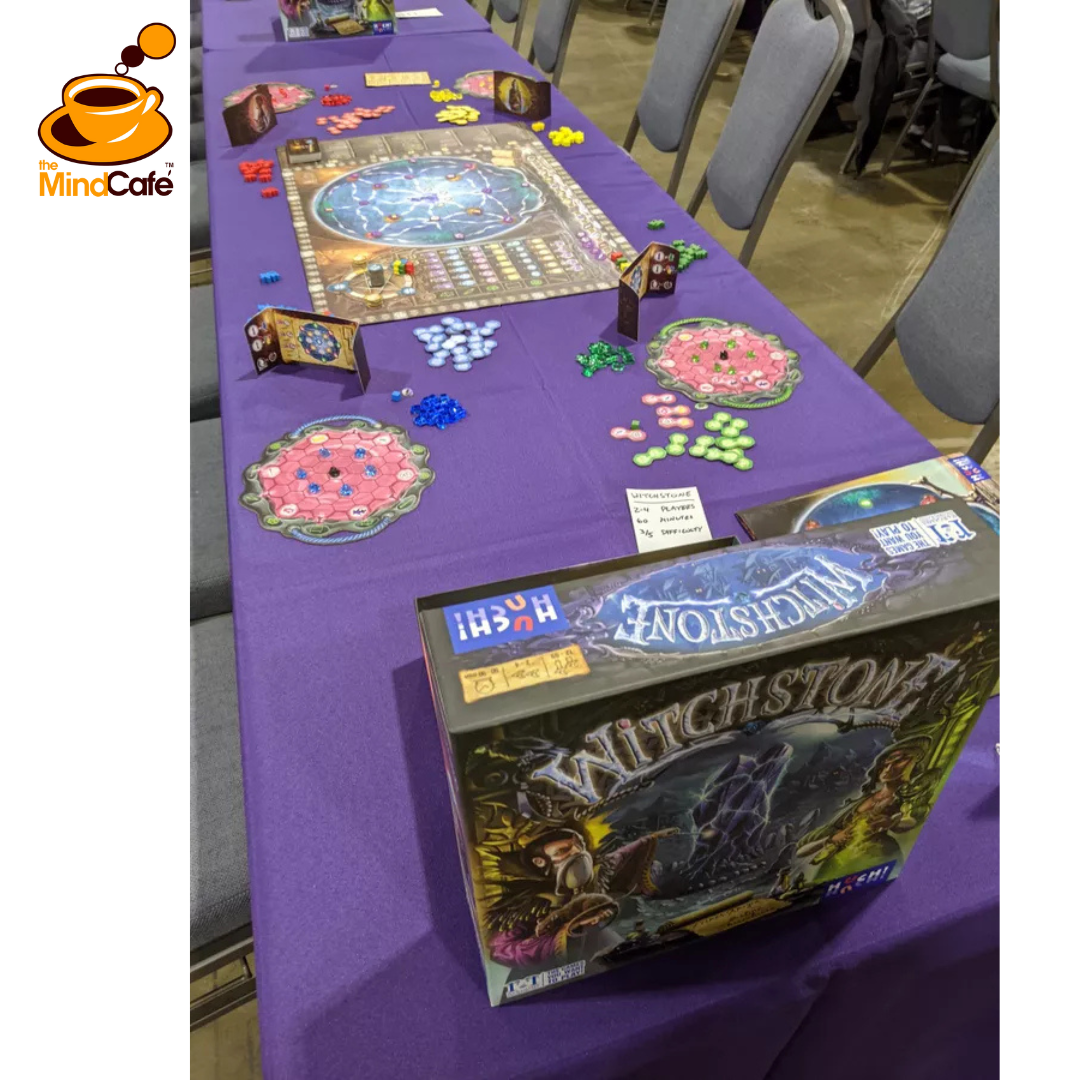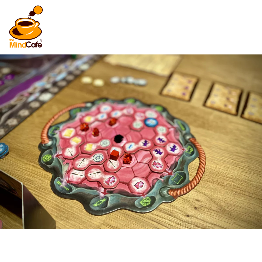 Move your token around a pentagram to collect points and to acquire bonus hex tiles; you can use these tiles immediately for actions or place them in your cauldron to make future tile placement more valuable.