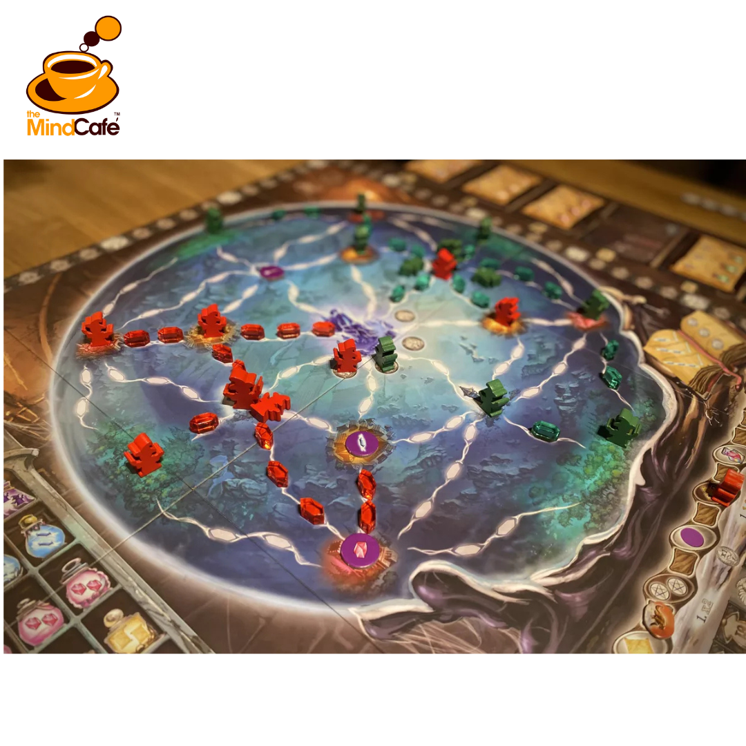 Place witches next to your starting tower on the game board or move them across your energy network to other locations. As you do this, you gain points and possibly additional actions to use the same turn.